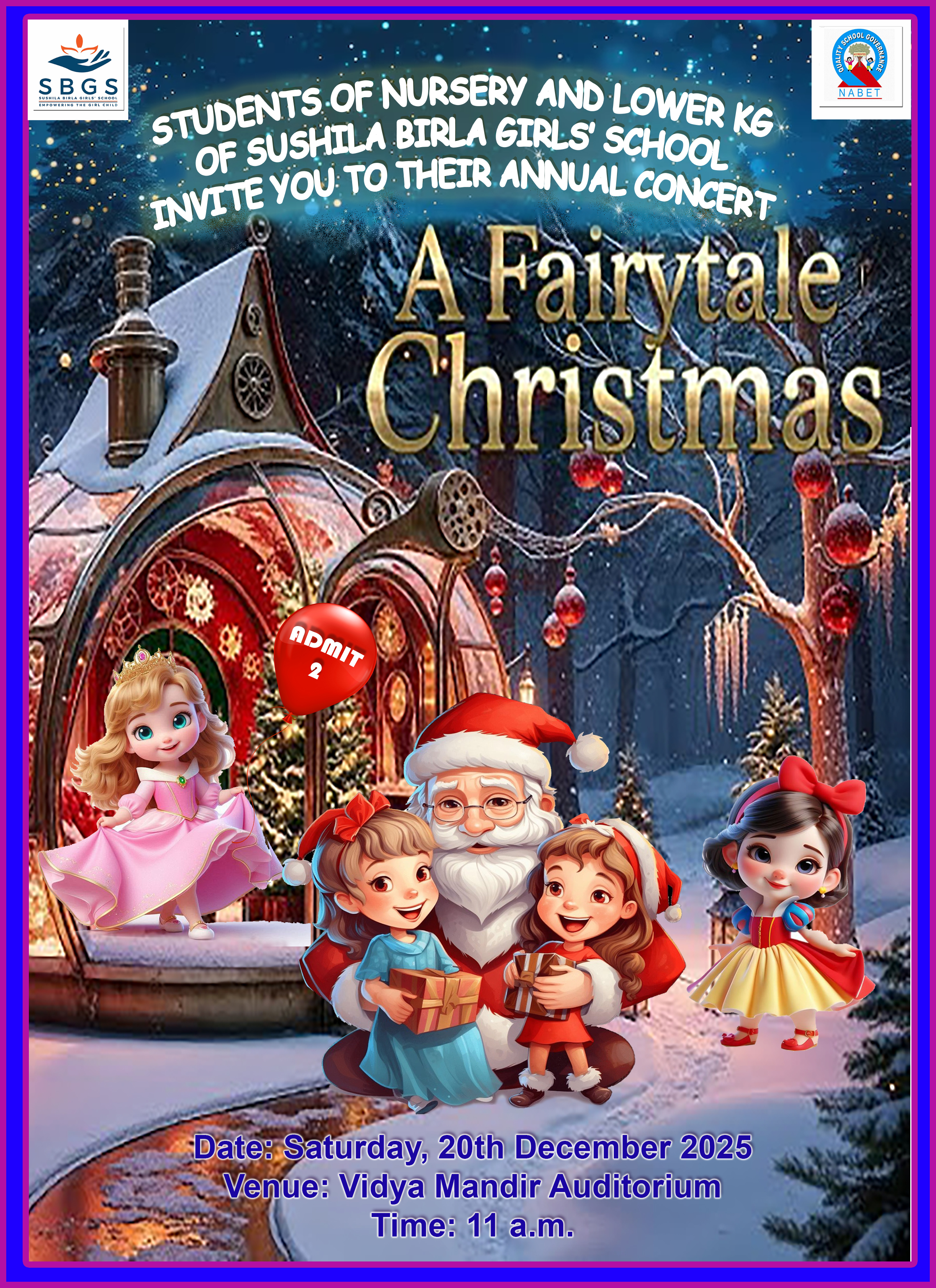 You are cordially invited to ‘A Fairytale Christmas’, the Annual Concert put up by the students of Classes Nursery and Lower Kindergarten on Saturday, 20th December 2025 at 11:00 a.m. at the Vidya Mandir Auditorium.